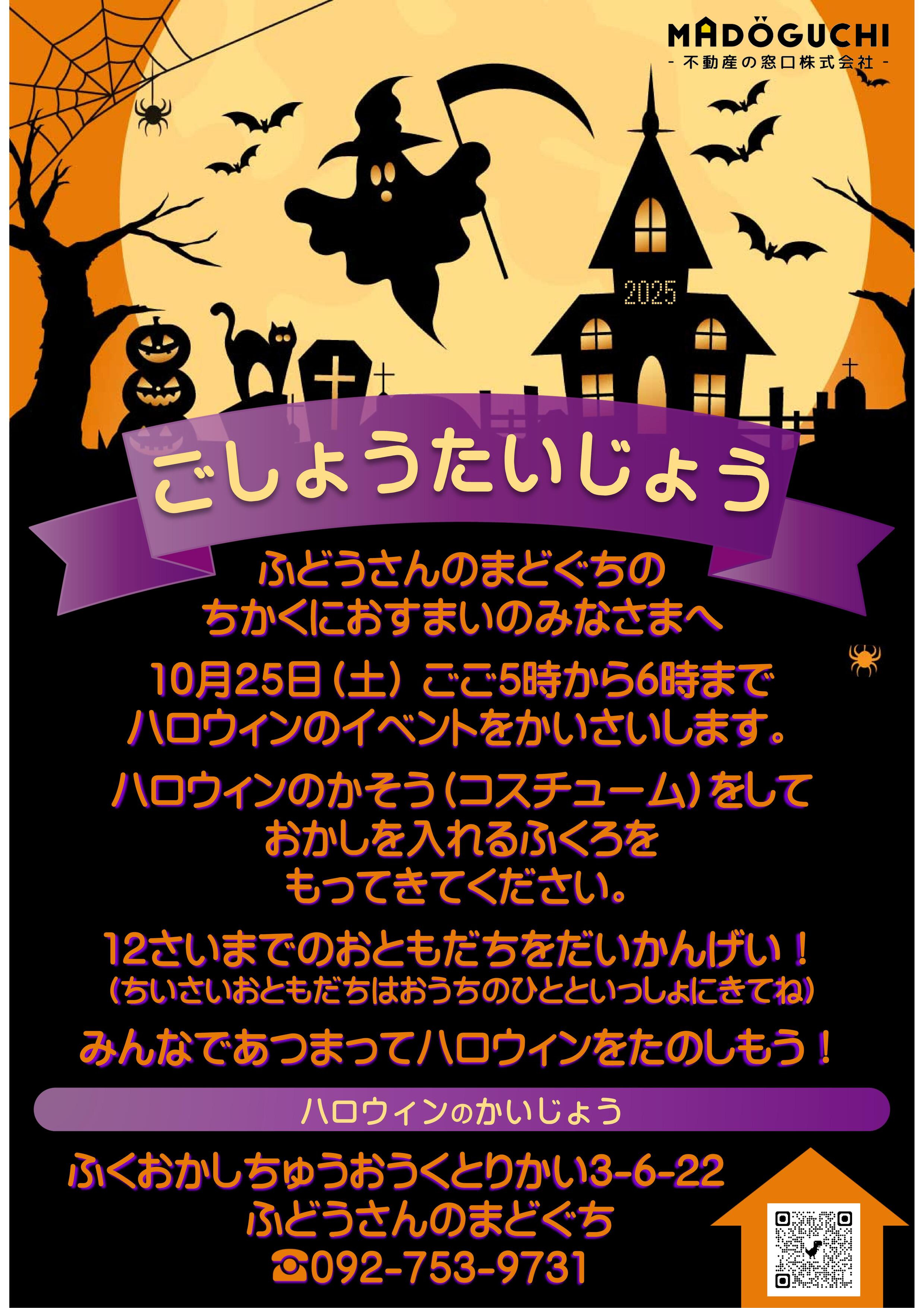 2025年10月25日(土)、不動産の窓口株式会社にて、地域にお住まいの子どもたちへ向けたハロウィンイベントを開催いたします。